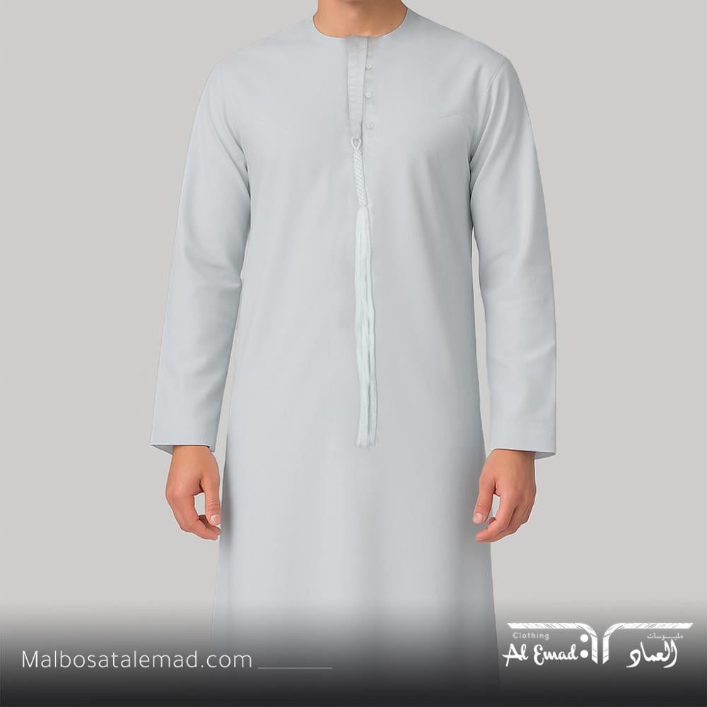 - تصميم أنيق وكلاسيكي: يتميز الثوب برقبة دائرية وكُمام طويلة، مما يعكس الطابع التقليدي مع لمسة عصرية.